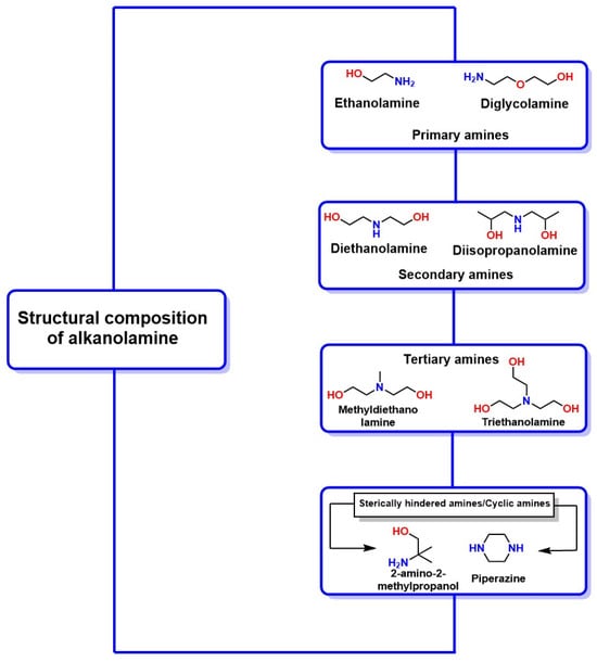 Chemical structure of amines used in acid gas absorption techniques [69,70,71].
