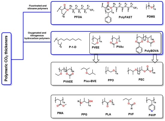 Molecular structures of polymers used as CO2 thickeners: PFOA: Poly(1,1-dihydro-perfluorooctyl acrylate) [82]. Polyfast: Poly(fluoroacrylate styrene) [82]. PDMS: Poly(dimethylsiloxane) [83]. P-1D: Poly(1-decane) [84]. PVEE: Poly(vinyl ethyl ether) [85]. PVAc: Poly(vinyl acetate) [86]. PolyBOVA: Poly(benzoyl-vinyl acetate) [86]. PVAEE: Poly(vinyl acetate-vinyl ethyl ether) [87]. Piso-BE: Poly(iso-butyl vinyl ether) [88]. PPO: Poly(propylene oxide) [85]. PEC: Poly(ether carbonate) [89]. PMA: Poly(methyl acrylate) [89]. PPG: Poly(propylene glycol) [89]. PLA: Poly(lactic acid) [89]. PVF: Poly(vinyl formate) [85]. P4VP: Poly(4-vinyl pyridine) [85].