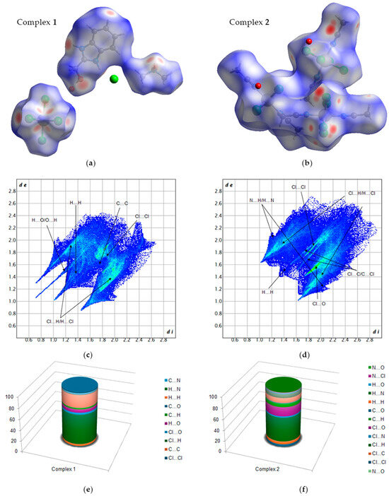 Hirshfeld surface (HS) analysis and 2D fingerprint plots revealed various intermolecular interactions in the crystal structure of complex 2 (Figure 4b). Red spots on the Hirshfeld surface indicate the presence of reciprocal contacts involving Cl⋯H, Cl⋯O, Cl⋯C, and Cl⋯Cl. The 2D fingerprint plot demonstrates that the crystal packing is predominantly influenced by Cl⋯H/H⋯Cl contacts, which account for 45.4% of the total interactions (Figure 4f). These contacts are depicted in the 2D plot as two symmetric external spikes, indicating the presence of numerous C-H⋯Cl type hydrogen interactions (Figure 4d). A significant contribution to the Hirshfeld surface is also made by Cl⋯O/O⋯Cl contacts (Figure 4d,f), which account for 16.8%. These contacts are associated with interactions between coordinated chloride ions and water molecules. H⋯H contacts appear in the 2D fingerprint plots as widely scattered points of low density, reflecting the low hydrogen content in the molecule. Their contribution to the Hirshfeld surface is estimated to be 8.3% (Figure 4f). The contributions of H⋯N/N⋯H contacts in the crystal are represented as characteristic wings, accounting for 6.9% of the surface contribution (Figure 4d,f). Additional smaller contributions from other intermolecular contacts on the Hirshfeld surface include Cl⋯C/C⋯Cl (5.4%) and Cl⋯Cl (4.5%).