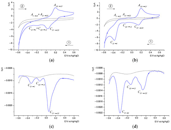 The redox properties of the ruthenium(IV) complexes were investigated using cyclic voltammetry (CV) and differential pulse voltammetry (DPV) in a mixture of acetonitrile and ethanol, with TBAPF6 serving as the supporting electrolyte. The voltammograms for the complexes were recorded using a glassy carbon (GC) working electrode for CV and a carbon fiber (CF) working electrode for DPV, utilizing an Ag/AgCl reference electrode. Figure 5 presents the representative voltammograms of complexes 1 and 2 within the potential range of −0.6 to 0.6 V at a scan rate of 50 mV s−1. It is important to highlight that the ligand appears to lack electroactivity under the experimental conditions (indicated by the dashed line in Figure 5a,b).