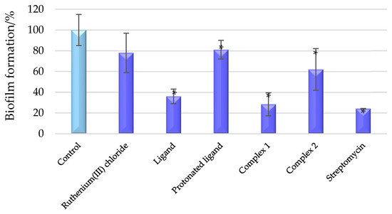 While bacteria are unicellular organisms, they primarily exist in natural environments within biofilms. These single-celled organisms form biofilms because these structures can protect them from extreme temperatures, ultraviolet radiation, limited nutrients, antibiotics, and other stressors [30]. Consequently, biofilms become more difficult to eliminate using standard methods. To assess the ability of the obtained ruthenium complexes to inhibit biofilm formation by the P. aeruginosa PAO1 isolate, bacterial cells were treated with complex 1 and complex 2 at a concentration of 1 mM. For comparative analysis, ruthenium(III) chloride, ligand, and the protonated form of the ligand were also tested at the same concentration for their antibiofilm activity. The studies were conducted using crystal violet staining of the biofilm. The results of these experiments are illustrated in Figure 6. As depicted in Figure 6, the RuCl3, the protonated organic ligand, and complex 2 did not exhibit a significant inhibitory effect on P. aeruginosa PAO1 biofilm formation. In contrast, complex 1 was found to inhibit biofilm formation in the PAO1 strain by upwards of 70% at a concentration of 1 mM. It is worth mentioning that a previous study involving the same ligand and Ru(IV) ion demonstrated a similar level of inhibitory activity (78%) [22]. Furthermore, these values are comparable to those obtained for the antibiotic streptomycin. The results of the antibiofilm assay for complex 1 indicate that the effect of the [RuCl6]2− anion is the most significant contributor to the activity of the compound, as only a minor antibiofilm effect is observed for the protonated ligand.