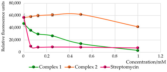 Influence of complexes 1 and 2, and streptomycin on pyoverdine production of P. aeruginosa PAO1. Mean values ± standard deviations for at least three replicates are illustrated.