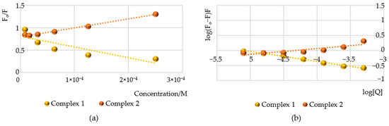 where F and Fo represent the fluorescence intensities in the absence and in the presence of complexes 1 and 2, Kq is the quenching rate constant of biomolecule, τ0 is the average lifetime of the biomolecule without quencher (τ0 = 6.2 ns), Ksv is Stern–Volmer constant (Figure 8a), and [Q] is the concentration of quencher. The Stern–Volmer quenching constant (Ksv) and the rate constant for quenching (Kq) were estimated and are presented in Table 5. Both Ru(IV) complexes exhibited a linear relationship when plotting Fo/F against [Q], with regression coefficients (R2) of 0.76 or 0.97. As it is seen, the plot of Fo/F for HSA versus [Q] ranging from 7.8 × 10−6 M−1 to 500 × 10−6 M−1 is linear for complex 1. This may suggest that a mixed quenching mechanism, either static or dynamic is observed at these concentrations [33,34]. The binding constant of Ksv was calculated to be 1.98 × 103 M−1. In the case of complex 2, the observed increase in quenching values (Fo/F) with rising concentration suggests the occurrence of dynamic quenching. This observation implies that the Stern–Volmer constant (Ksv) is proportional to the concentration of the quencher, indicating a quenching mechanism associated with energy transfer to the quencher molecules. This interpretation is supported by the Ksv values, which increase significantly with higher concentrations of the quencher. Additionally, the quenching rate constant (Kq = 3.19 × 1011 M−1s−1) further corroborates the dynamic process. The high value of Kq indicates that the reactants are converted to products within a very short time frame, suggesting that the quenching process is far from equilibrium—a characteristic feature of dynamic mechanisms. According to the literature [35,36], the maximum scattering collision-quenching constant (Kq) for various quenchers with the biopolymer is 2 × 1010 M−1s−1. Therefore, the quenching constants for the protein quenching process initiated by complex 2 exceed this maximum scattering collision-quenching constant. As observed in the Stern–Volmer plots (Figure 8a), the calculated value of Ksv is on the order of 103, indicating that the interaction mechanism between HSA and complex 2 is likely initiated by dynamic collision. The binding constant (Kb) for HSA with the Ru complexes was estimated using the double logarithmic Stern–Volmer equation: