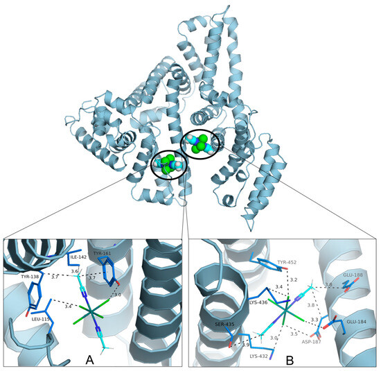 In the docking studies, two possible binding regions for complex 2 were identified (Figure 9), and none of them covers albumin’s pockets defined for typical organic ligands, e.g., warfarin or ibuprofen [38]. One of the identified regions is in proximity of the area where the reference ruthenium complex binds (7DL4 crystal structure [37]). The investigated complex 2 forms an HSA/2 adduct by weak van der Waals interactions with LEU115, TYR138, ILE142, and TYR161 and one plausible O–H⋯Cl hydrogen bond with TYR161 as a donor (Figure 9A). In the second, non-specific but also more hydrophilic binding position (Figure 9B) the ligand molecule is forming a mixture of stronger and polar interactions between chloride ligands and GLU184, ASP187, and TYR452, weak hydrogen bonds with acetonitrile methyl groups as donors and GLU188, SER435 as acceptors. Moreover, LYS432 and LYS436 methylene groups form weak hydrogen bonds with chloride ligands as acceptors. Additionally, weak van der Waals contacts with ASP187 and GLU188 are observed.
