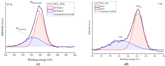 Diagnostics by X-ray photoelectron spectroscopy was performed using a K-Alpha spectrometer (Thermo Scientific, Waltham, MA, USA), equipped with a monochromatic Al Ka X-ray source (λ = 1486.6 eV). The residual pressure in the analytical chamber was approximately 4 × 10−9 mbar. The XPS measurements were conducted with a resolution of 1 eV for the survey spectrum, and the core level spectra of oxygen, sulfur, and tungsten were obtained with a resolution of 0.1 eV. In order to evaluate the contribution of different chemical environments of elements, the obtained spectra were deconvolved using Gaussian functions. A linear background was preliminarily subtracted.