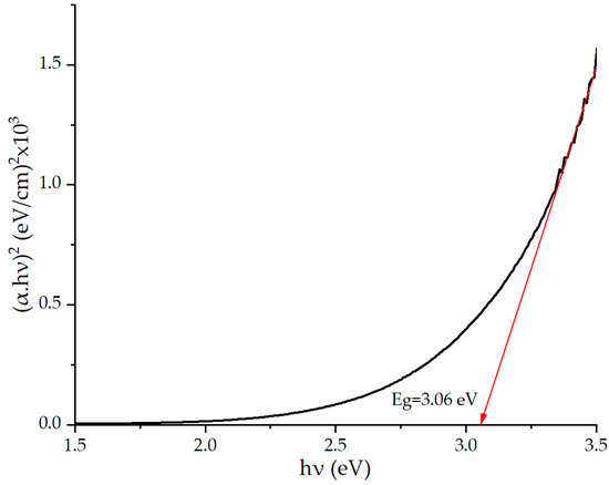 Based on the results of absorption spectroscopy, the optical band gap of the composite was estimated. A Tauc plot was constructed, where α is the absorption coefficient of the medium, and hν is the energy of light incident on the sample. The coefficient n depends on the type of interband transitions. For tungsten oxide, n = ½, since it is an indirect band gap semiconductor. The experimental optical band gap Eg was determined to be 3.06 eV (Figure 4) and is consistent with data in the literature for tungsten oxide [71,72].