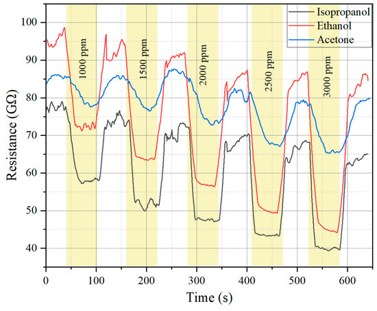 The sensor response to isopropanol, ethanol, and acetone at increasing concentrations (1000–3000 ppm) is presented in the resistance–time plot (Figure 5) and response–concentration curve (Figure 6).