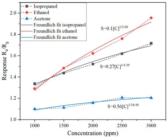 where C is the target gas concentration, and A and B are fitting parameters [73]. The values of A and B are also presented in Figure 6. The calculated detection limits are 500 ppm for ethanol, 600 ppm for isopropanol, and 750 ppm for acetone.