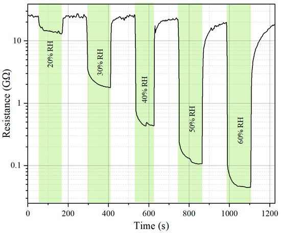 The resistance of the sensor shows a significant dependence on relative humidity (RH), as illustrated in Figure 8. When exposed to increasing RH levels (20%, 30%, 40%, 50%, and 60%), the sensor resistance exhibits a clear downward trend.