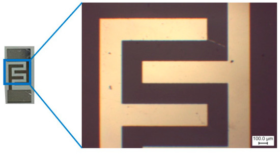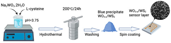 Glass ceramic (ST-50-1-1-0.6, roughness—0.032 μm) substrates with aluminum electrodes were used for applying WO3−x/WS2 sensor layers (Figure 10). To deposit the WO3−x/WS2 sensor layer on a substrate, approximately 0.2 g of powder was mixed with 2 mL of isopropyl alcohol and placed in an ultrasonic bath for 30 min. After that, 20 μL of the resulting solution was applied on pre-cleaned substrates by spin-coating. To form a thin layer, spin-coating was carried out at 2000 rpm for 15 s, and then at 3000 rpm for the same time. This process was repeated 20 times until a relatively homogeneous, dense layer covered the entire area of the substrate. The resulting layer was then dried for 30 min at 75 °C. The synthesis process is shown in Figure 11.