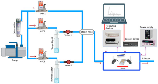 The system is designed to generate vapor flows and measure the gas-sensing properties of materials by monitoring changes in electrical resistance under exposure to target vapors or humidity. The vapor generation setup includes an air pump that supplies dried air into three separate branches. In the first branch, the airflow is regulated by MFC 1, which works together with MFC 2 and MFC 3 to control the concentration of gas vapors and relative humidity before the flow enters a mixing chamber. The second branch uses MFC 2 to direct air through a bubbler containing the target solution, such as isopropanol, ethanol, or acetone, where the airflow pressure causes the liquid to transition into vapor. Similarly, the third branch generates water vapor by passing air through a bubbler filled with distilled water. These vapor flows are uniformly mixed in a mixing chamber before being introduced into a sample chamber for testing. To calculate the pressure of saturated vapors of the liquid in the bubbler, the Antoine equation is used.