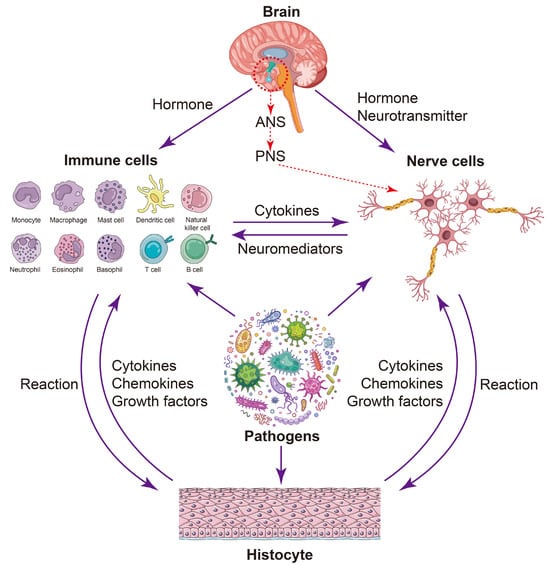 Bidirectional communication between the neuroendocrine and immune system. An intricate interplay exists between the neuroendocrine system and the immune system. Firstly, pathogens can induce immune cells to produce cytokines and nerve cells to release neuromediators, thereby facilitating the exchange of these chemical signals between immune cells and nerve cells. Secondly, pathogens can also stimulate other cell types, such as epithelial cells, leading to the secretion of effector molecules including cytokines, chemokines, and growth factors. These factors can further activate immune cells and nerve cells through receptor-mediated responses to pathogen stimulation. Additionally, the involvement of the hypothalamic–autonomic nervous system axis (HANS) should be considered. For instance, the brain–gut axis has been shown to trigger hypothalamus–pituitary–adrenal function within the central nervous system (CNS). The diagram of the immune cells was refined based on Krause’s work []. The diagram of the brain, pathogens, and nerve cells was designed by pch.vector/Freepik.