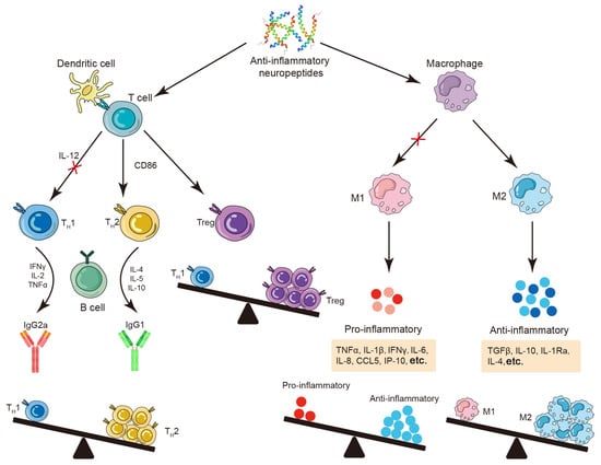 A previous study revealed that CD4+ and CD8+ TH2 immune cells are the primary sources of VIP in response to inflammatory stimuli or antigen activation []. Additionally, α-MSH is predominantly expressed in lymphocytes and monocytes, and its production is stimulated by inflammatory factors []. Research has shown that VIP and α-MSH act as potent anti-inflammatory agents, effectively inhibiting the production of inflammatory mediators (TNFα, IL-6, and IL-1β) and chemokines (CCL5, IL-8, and IP-10), downregulating inducible nitric oxide synthase (iNOS) expression, and thus diminishing nitric oxide (NO) release. Meanwhile, the activation of macrophages, microglia, and monocytes enhances the production of the anti-inflammatory cytokines IL-10 and TGFβ []. Concurrently, VIP and α-MSH play crucial roles in modulating the balance between TH1 cells and regulatory T cells within the organism (Figure 2). This regulation ensures a stable equilibrium between anti-inflammatory and pro-inflammatory factors, thereby reducing the risk of autoimmune diseases []. Moreover, neuropeptides can influence macrophages to effectively modulate the M1/M2 balance and enhance the body’s anti-inflammatory capacity (Figure 2) [].
