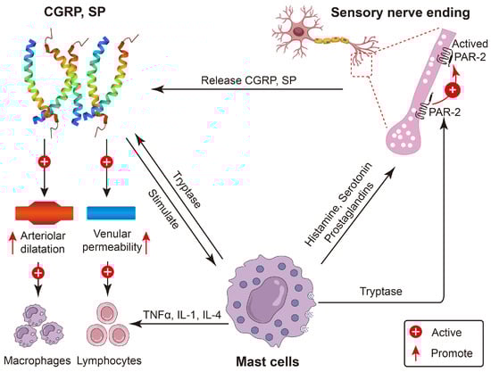 The regulatory role of CGRP in inflammatory responses remains a subject of debate, with some researchers contending that it promotes pro-inflammatory effects, whereas others assert anti-inflammatory effects. Some studies indicate that CGRP can facilitate the onset of inflammatory responses. For example, in macrophages infected with HSV-1,CGRP either alone or in combination with SP, the secretion of the pro-inflammatory cytokines IL-1β and TNF was significantly increased []. CGRP has the capacity to activate mast cells, promoting the release of histamine, which in turn increases vascular permeability and fosters an environment conducive to inflammation (Figure 3) []. Research on satellite glial cells has shown that CGRP can induce the expression of pro-inflammatory genes and facilitate the release of IL-1β. However, the molecular mechanisms through which CGRP mediates its pro-inflammatory effects on satellite glial cells remain inadequately understood [].