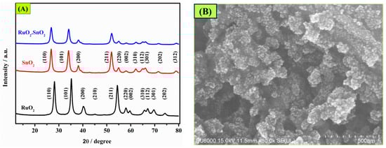 The phase compositions of the synthesized catalyst were analyzed with the help of an X-ray diffraction (XRD) study; the observed XRD pattern is presented in Figure 1A. It is seen that the crystalline phase of the pure SnO2 is the tetragonal rutile phase, which is also the major bulk phase found in the synthesized RuO2.SnO2 catalyst. However, peaks belonging to RuO2 were not found in the case of the composite catalyst, suggesting a probable formation of a solid solution through the insertion of Ru4+ cations into the crystal lattice of SnO2 [46,47,48]. The structural feature of both the oxides is almost identical, that is, tetrahedral, and both of the metallic ions have similar ionic radii, which could make the oxides prone to developing a solid solution with a defined lattice capacity [46,47,48]. Given the usage of a small amount of RuO2 in the synthesis process, it is conjectured that the lattice capacity of Ru is too small to detect the Ru–Sn–O solid solution by means of XRD analysis [46,47,48]. Consequently, all of the ruthenium-related species could be incorporated into the SnO2 lattice matrix.