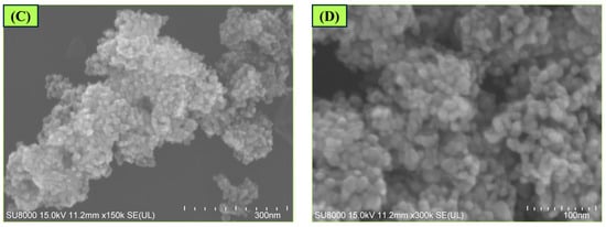 In order to assess the surface morphology of the synthesized catalyst, the scanning electron microscopy technique was employed, and the resultant images are illustrated in Figure 1C,D. It is apparent from the images that the surface of the catalyst is porous and has sponge-like morphology with significant roughness and complexity. Furthermore, SEM images reveal that the particles of the synthesized catalyst are of irregular shape due to the formation of clusters of small crystals. This observation indicates substantial enhancement of surface area, which might be beneficial for electrochemical application. The enhancement of surface area as a result of the incorporation of RuO2 into SnO2 matrix was proved by means of Brunauer–Emmett–Teller (BET) and Barrett–Joyner–Halenda (BJH) techniques, as described in our previous study [49].