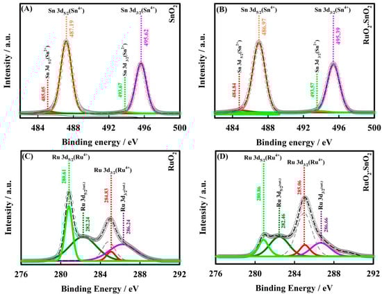 At this point, the X-ray photoelectron spectroscopic (XPS) experiments were performed to investigate the surface properties of the RuO2.SnO2 catalyst. Figure 4A,B illustrates the XPS spectra of Sn 3d of pure SnO2 and the synthesized RuO2.SnO2, respectively. The peaks belonging to the binding energy of 487.19 eV and 495.62 eV in Figure 4A might be attributed to the existence of Sn 3d5/2 and Sn 3d3/2 of Sn(IV) species in pure SnO2 particles, respectively [50]. In the case of RuO2.SnO2, these two peak maxima shifted to relatively lower binding energies, appearing at 486.97 and 495.39 eV for Sn 3d5/2 and Sn 3d3/2 (see Figure 4B and Table 1), respectively. A similar shift to low binding was also noticed in the case of the peaks that correspond to the Sn2+ cation, as shown in Figure 4A,B and Table 1. This lower shifting of the binding energy indicates the mobilization of electrons from the Ru to Sn species while the Sn–Ru–O solid solution was formed [49,50]. The phenomenon of electron transfer between Ru and Sn was further validated from the XPS spectra of Ru 3d and 3p. The XPS analysis of pristine RuO2 showed the appearance of peaks in the region of 280–290 eV, as presented in Figure 4C, in which the peaks at 280.61 and 284.83 eV after deconvolution can be attributed to Ru 3d5/2 and Ru 3d3/2 of Ru4+ cations, respectively [51,52]. These two peaks of Ru4+ ion in the case of RuO2.SnO2 shifted to the higher binding energy, as illustrated in Figure 4D, confirming the electronic transition from Ru to Sn metallic species. The shifting of peaks to higher binding energy was also observed in the case of Ru 3p, which is evident from the comparison of the peak positions of Ru 3p in RuO2 and RuO2.SnO2, as depicted in Figure 4E,F. A comparison of the major XPS peaks for Sn and Ru is presented in Table 1 for a better understanding in support of the spectra in Figure 4. Since the composite is formed by the combination of two oxide materials, it is necessary to examine the surface oxygen properties of the catalysts. In this regard, the XPS spectra of O 1s of pristine SnO2 and RuO2.SnO2 were analyzed.