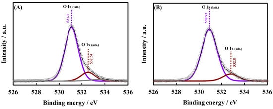 From Figure 5A,B, it is apparent that two peaks at 531 eV and 532.5 eV are present in both catalysts, and these peaks can be attributed to lattice oxygen (Olat) and adsorbed oxygen (Oads), respectively [50]. The molar ratio of these two different types of oxygen, that is, Oads/Olat, in the case of both SnO2 and RuO2.SnO2 was evaluated to be ca. 0.132 and 0.174, respectively. The increased molar ratio in the case of composite RuO2.SnO2, however, supports the development of the Sn–Ru–O bond in the solid-state material. Almost similar findings were also reported in our previous work, where this composite was synthesized for HER application [49]. However, due to the formation of solid solutions, lattice distortion may result in defect formation, which may enhance the generation of surface mobile oxygen species [53,54,55].
