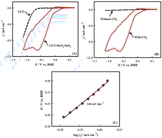 Herein, represents overpotential, and is the Tafel slope. The value of was calculated as 144 mV dec−1 from the correlation of log(j) and E vs. RHE, as shown in Figure 7C. Numerous research groups have previously analyzed the Tafel slopes of CO2RR to determine the reaction pathway. The Tafel slope in this study (144 mV dec−1) is consistent with the mechanism of CO2 reduction to formate, which involves the addition of one electron to the adsorbed CO2 to generate carbon dioxide radical anion as the initial RDS (rate-determining step), according to earlier studies [37,68,71,72,73]. The findings reveal that CO2RR at the GCE-RuO2.SnO2 electrode surface involves the transfer mechanism producing formate, where the conversion of CO2 to CO radical anion is the RDS.