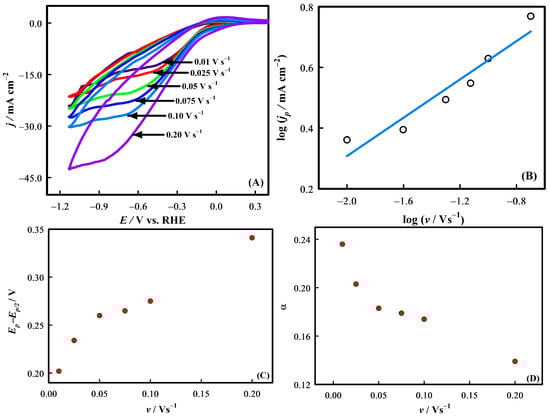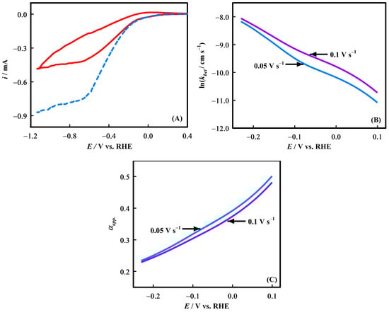 Figure 9B,C display the plots of lnkhet vs. E and α vs. E, respectively, in the case of two different scan rates. The curving behavior observed in Figure 9B suggests that the ET kinetics of CO2RR at the GCE-RuO2.SnO2 surface was potential-dependent [68,78]. From Figure 9C, it is evident that the α value was ca. 0.5 near the onset potential (0.0998 V vs. RHE) and then declines to 0.23 around −0.2202 V vs. RHE. This decrease in α (α < 0.5) within the potential range (0.0998 V to −0.2202 V vs. RHE) suggests that the protonation and electron release steps occur simultaneously [68,72]. Furthermore, αapp becomes equal to 0.5 at E = E°′, which indicates a nonlinear electron transfer process [79]. Thus, by adjusting αapp = 0.5 in Figure 9C, the formal potential (E°′) value regarding CO2RR was calculated to be 0.0998 V vs. RHE, which is consistent with the OCP value. Finally, the standard rate constant (ko) was estimated as 2.89 × 10−5 cm s−1. Therefore, at this point, it can be concluded that the CO2RR mechanism at the GCE-RuO2.SnO2 electrode surface is highly dependent on the applied potential, where a potential of 0.0998 V vs. RHE represents the breakthrough point.