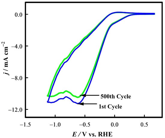 The stability of the GCE-RuO2.SnO2 electrode was then investigated by conducting 500 CV cycling with the electrode in CO2-saturated imidazole solution. However, no significant change in the onset potential (Ei), peak potential (Ep), and peak current (Ip) was observed after 500 cycles of CV runs, boasting an impressive stability of the proposed electrode, as shown in Figure 10.