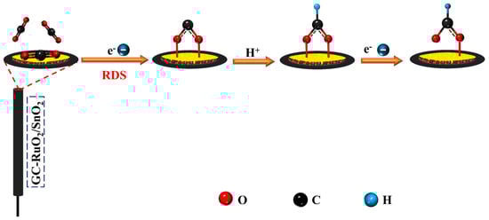 An α value less than 0.5 indicates the presence of a slow step, in which radical species (COO•−) are formed following the initial ET [80]. This observation further suggests a two-step ET process, with the first step being the slowest, followed by a faster heterogeneous electron transfer. Consequently, the rate of radical anion formation on the catalytic surface is slower compared to the rate of the second ET [81]. The initial ET step, becoming the RDS in CO2RR over the developed GCE-RuO2.SnO2 electrode, strongly suggests the formation of formate anion via a two-electron transfer step, as illustrated in Scheme 2 [82].
