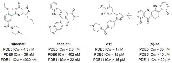 Inhibition of PDE5 has been validated to enhance cGMP levels in specific tissues and benefit patients with various diseases such as male erectile dysfunction and pulmonary arterial hypertension [15,16,17]. The therapeutic potential of PDE5 inhibitors has led to the development of several drugs with the most well-known ones being sildenafil citrate and tadalafil (Figure 1) [18,19]. However, most of the reported PDE5 inhibitors lack selectivity over PDE6 or PDE11 and may cause unneglectable side effects [20,21]. This is due to the extreme similarity of the catalytic domains of PDE5 and PDE6/PDE11 where competitive inhibitors bind (sequence similarities exceeding 50%) [22]. Many PDE5 inhibitors exhibit similar pharmacophore features to PDE6 ones, such as a purine-like fused ring and alkoxybenzene moiety, leading to concurrent inhibition against PDE6. Using these PDE5 inhibitors with limited selectivity can result in off-target inhibition of PDE6 in the retina, which disrupts visual processes, or PDE11 in muscle tissue, leading to muscle pain and other systemic effects. For example, administration of sildenafil frequently causes visual disturbances, facial flushing, or headaches. Administration of tadalafil frequently causes back and muscle pains [23]. Recently, Abdel-Halim and coworkers developed a novel PDE5 inhibitor d12 based on celecoxib, with over 10,000-fold selectivity over PDE6 and PDE11 [24]. The d12 was deduced to bind to the interface region between the regulatory/catalytic domain or an allosteric site on the regulatory domain. At the same time, novel evodiamine derivatives were synthesized and validated to be highly selective PDE5 inhibitors by Zhang and coworkers [25]. Among them, (S)-7e demonstrated over 500-fold selectivity against PDE6 and PDE11. X-ray crystal structure research discovered a unique allosteric pocket in the C-terminal of PDE5 with bound (S)-7e for the first time. Thus, targeting this allosteric pocket provides a novel means of designing and developing PDE5 inhibitors with minimal side effects caused by simultaneous inhibition of PDE6/PDE11.