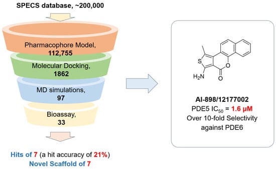 With our continuous interest in the discovery of novel PDE inhibitors [26,27,28], herein we applied an established virtual screening method combining pharmacophore modelling, molecular docking, and molecular dynamics simulations to discover novel PDE5 inhibitors targeting the unique allosteric pocket in the catalytic domain. Seven out of thirty-three molecules purchased from the SPECS database (a hitting accuracy of 21%) with novel scaffolds were validated as PDE5 inhibitors with more than 50% enzymatic inhibition ratios at a concentration of 10 μM. In particular, compound AI-898/12177002 (IC50 = 1.6 μM) demonstrates over 10-fold selectivity towards PDE6 (Figure 2).