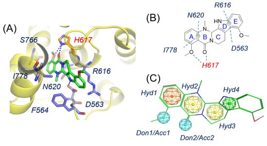 Binding pattern of (S)-7e with PDE5 (A,B) and established pharmacophore model (C). His617 was deduced as a key residue for the binding of the allosteric inhibitor, which is labeled in red.