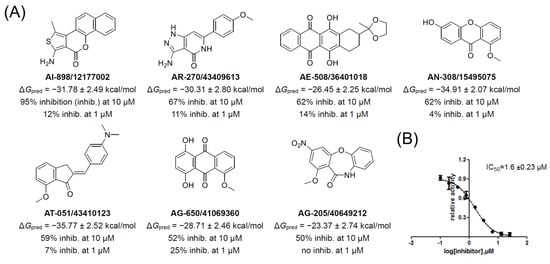 (A) Chemical structures of the hits, their predicted binding free energies based on MM-GBSA method (ΔGpred), and inhibition ratios. (B) The inhibitory profile of AI-898/12177002 with an unambiguous dose-dependent effect.