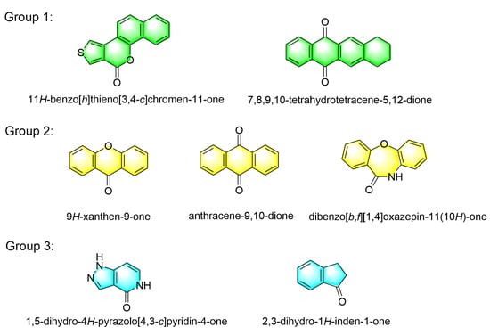 All hits feature new scaffolds compared to existing PDE5 inhibitors, as indicated by molecular similarity calculations (see Table S2). These seven identified PDE5 inhibitors can be classified into three groups based on the number of fused rings in their scaffolds. Group 1 includes AI-898/12177002 and AE-508/36401018, which contain four fused rings. Group 2 includes AN-308/15495075, AG-650/41069360, and AG-205/40649212, which contain three fused rings. Group 3 consists of AR-270/43409613 and AT-051/43410123, which contain two fused rings (Figure 5).