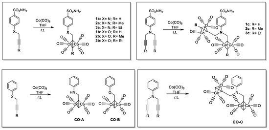 - Schimler, S.D.; Hall, D.J.; Debbert, S.L. Anticancer (Hexacarbonyldicobalt)Propargyl Aryl Ethers: Synthesis, Antiproliferative Activity, Apoptosis Induction, and Effect on Cellular Oxidative Stress. J. Inorg. Biochem. 2013, 119, 28–37. [Google Scholar] [CrossRef] [PubMed]