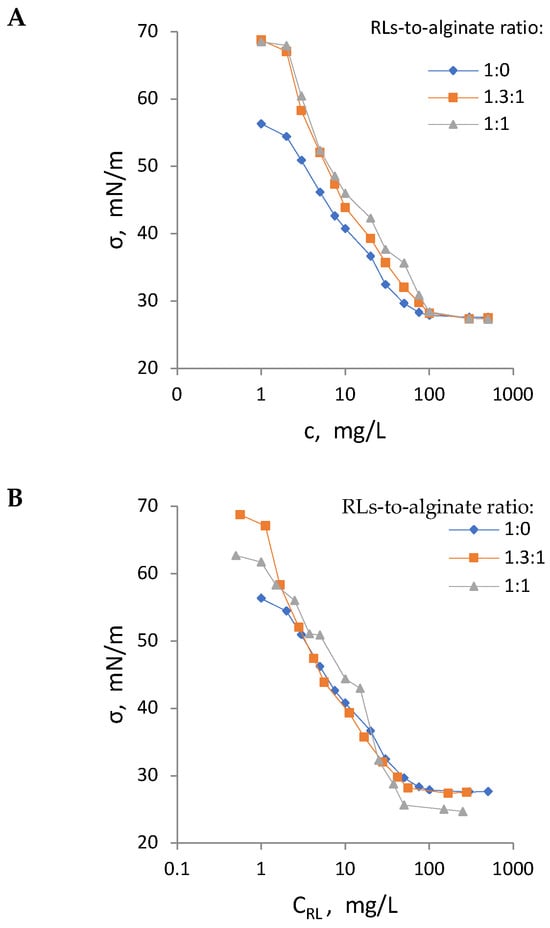 Surface tension isotherms for various RL preparations: RLs alone and their mixtures with alginate at 1.3:1 and 1:1 w/w ratios (model RLBCs). Isotherms are plotted against the concentration of the RL preparation as a whole (A) or recalculated based solely on the RL content within the RL preparation (B).