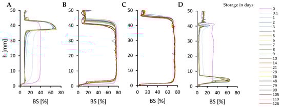 Backscattering (BS) analysis of emulsions stabilised by 0.15% (w/w) of RLBC and containing 10% (A), 70% (B), 80% (C), or 90% (D) of oil phase. Visible droplet migration instability (such as creaming) of emulsions containing up to 70% oil phase (e.g., BS peak formation in the uppermost location of the sample shown in (A) and phase separation in the emulsion with 90% oil (BS decrease over time and accumulation of remaining emulsion in the lower part of the sample shown in (D) can be seen)).