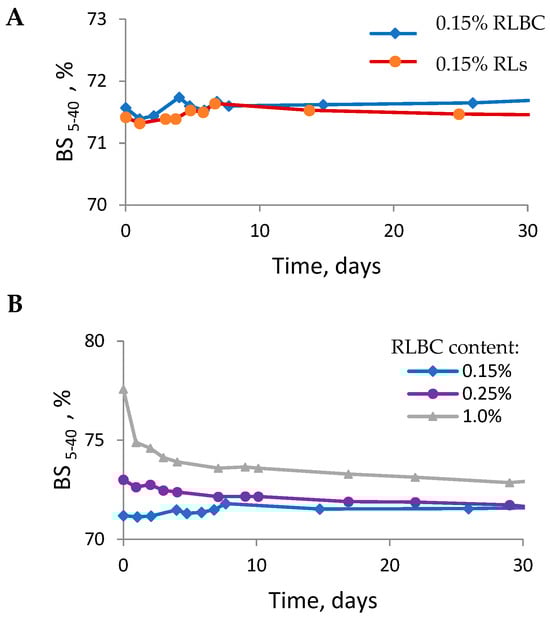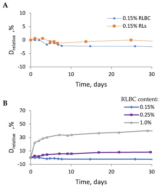 The average oil droplet size measured by DLS was 9.54 ± 0.96 μm for the 0.15% RLBC-stabilised emulsion, compared to 8.93 ± 0.58 μm for the emulsion stabilised with pure RLs. Both emulsions were relatively monodisperse, with PDI values of 0.339 ± 0.121 and 0.229 ± 0.084 for RLBC and RLs, respectively. Time-dependent relative changes in oil droplet diameter were calculated using MLS analysis (Figure 5). Consistent with the DLS results, the MLS-measured droplet size was similar for emulsions stabilised with either biosurfactant (i.e., RLBC or RLs) at 0.15% w/w (Figure 5A). Moreover, the MLS-based droplet size did not vary significantly over time, whereas notable changes in relative diameter were observed in emulsions prepared with higher RLBC concentrations (Figure 5B). The final droplet size of emulsions stabilised with 0.15% RL preparations was established within the first few days after preparation, with higher biosurfactant concentrations requiring more time for the emulsion’s final structure to develop. For example, in emulsions with 1.0% RLBC, the final oil droplet size required approximately 10 days to develop.
