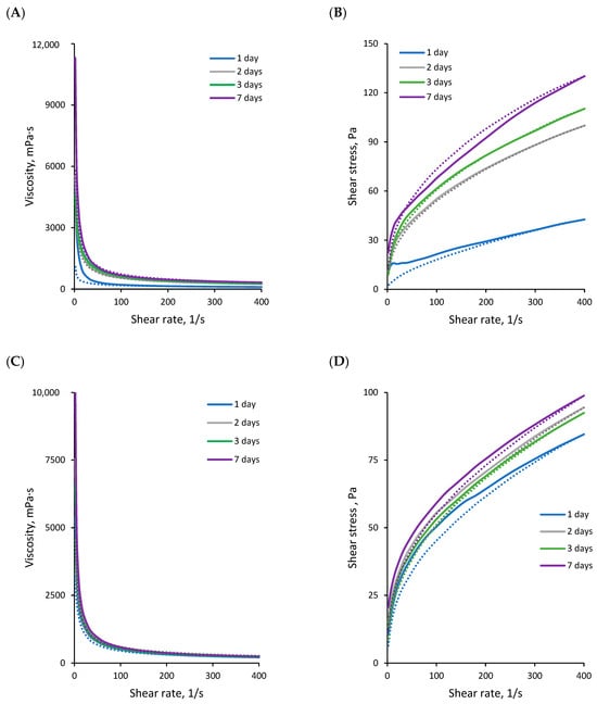 Storage time-dependent rheological properties of rapeseed oil emulsions (80%) stabilised with 0.15% RLBC (A,B) or purified RLs (C,D): viscosity (A,C) and flow curves (B,D) at ascending (solid lines) and descending (dashed lines) shear rates.