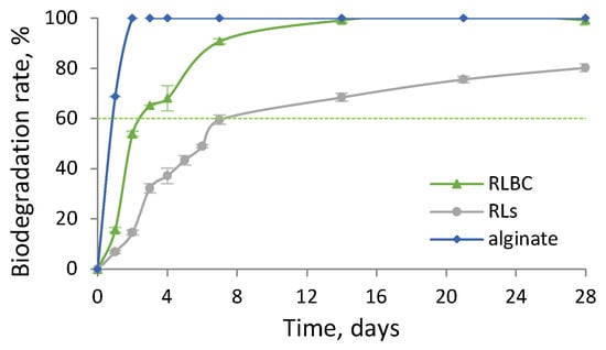 Time-dependent biodegradation rate for RLBC, RLs, and alginate.