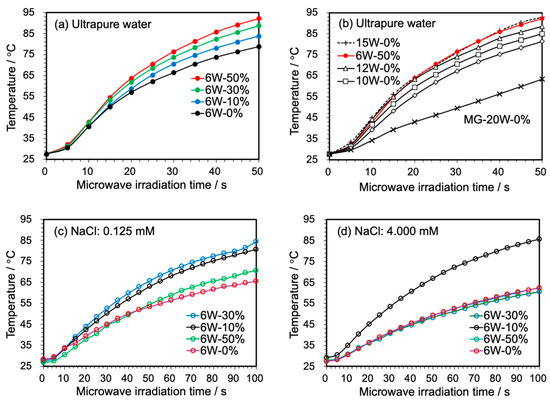 Temperature–time profiles in the heating of (a,b) ultrapure water and (c,d) NaCl aqueous solution (each 0.5 mL) placed in a quartz sample tube and subjected to irradiation with 6 W microwaves (2.45 GHz) generated from a semiconductor generator with and without 10 kHz amplitude modulation (amplitude-modulated wave) and 20.0 W microwaves from a conventional magnetron generator. Description: 6W-0%: 6.00 W power with no modulation; 6W-10% to 6W-50%: 6.00 W power with 10–50% modulation with 10 kHz amplitude modulation; 10W-0% to 15W-0%: 10–15 W power with no modulation; MG: magnetron, 20.0 W power with no modulation.