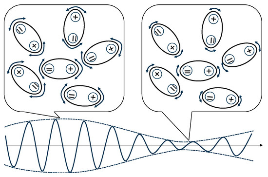 The differences observed may be attributed to an indirect effect. Unlike continuous waves (CWs), which deliver energy at a steady intensity, microwaves with amplitude modulation (AM) vary their energy output over time. This fluctuation impacts both the timing and the quantity of energy absorbed by water molecules (see Figure 2). Notably, the maximum absorption rate of water within the microwave spectrum occurs around 10 GHz, while 2.45 GHz is not optimal for absorption [13]. Therefore, utilizing a low-frequency amplitude-modulated wave, such as 10 kHz AM, could result in nonlinear behavior in energy delivery, and the resultant localized temperature variations in the water may indirectly affect the relaxation time.