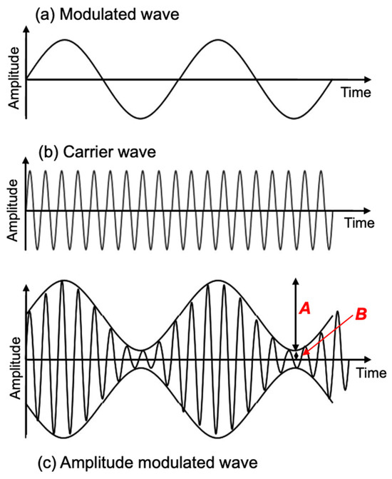 Configuration image of an amplitude modulation (amplitude-modulated wave) of the 2.45 GHz microwaves: (a) modulated wave, (b) carrier wave, and (c) amplitude-modulated wave. The A and B in (c) denote the maximal and minimal amplitudes.
