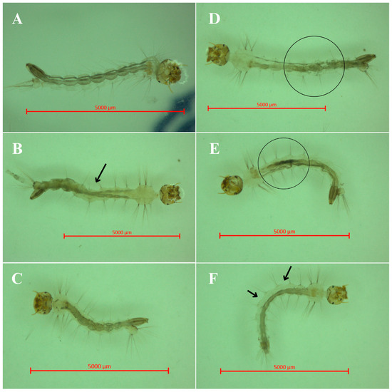 Morphological alterations in BSAW (biosurfactant from andiroba wastes)-treated larvae. (A) Control larva; (B–F) BSAW-treated larvae; (B) Exoskeleton deformation; (C) Larval shortening; (D) Intestinal disintegration; (E) Melanization; (F) Peritrophic membrane detachment. Circles and arrows highlight observed changes.