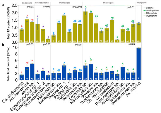 Distribution of total FA and lipid contents across Red Sea photobiota. (a) Total content of FA (mean % DW). (b) Total content of lipid (mean % DW). Bars show means, with error bars indicating standard error. Statistical analyses: Kruskal–Wallis test followed by the Dunn test, where species ranks that do not share a letter are significantly different. Color-coded letters above the bars correspond to the comparisons within the respective group panel. White letters inside the bars correspond to the comparisons across all species. Replicates from each species and the mean from five biological replicates of leaves of Av. marina were used in the comparison. FA, fatty acid; DW, dry weight.