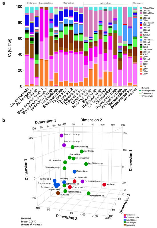 Fatty acid (FA) profiles and patterns of Red Sea photobiota. (a) FA profiles (%DW); DW, dry weight. (b) Three-dimensional nonmetric multidimensional scaling (NMDS) ordination of mean FA percentage data.