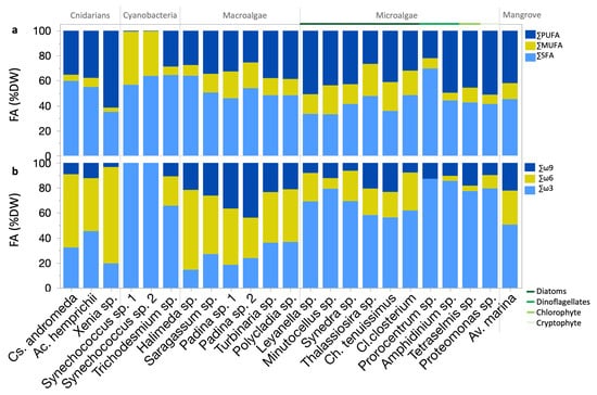 Total FA contents per dry weight (DW) of tropical biota found averaging 9.8 mg g−1 DW (range: 1.7–17.8 mg g−1 DW). FA content varied significantly across species (p < 0.0001; Kruskal–Wallis test; Figure 1a). Interspecific variations were significant within groups (p < 0.01 or p < 0.0001; Kruskal–Wallis test), except within cyanobacteria (Figure 1a). The organisms analyzed included the macroalgae Sargassum sp., Turbinaria sp., Polycladia sp., Padina sp. 1, Padina sp. 2, and Halimeda sp., eukaryotic microalgae—including the diatoms Cylindrotheca closterium (Cl. Closterium), Thalassiosira sp., Synedra sp., Chaetoceros tenuissimus (Ch. tenuissimus), Leyanella sp., and Minutocellus sp., the dinoflagellates Amphidinium sp. and Prorocentrum sp., the cryptophyte Proteomonas sp. and the chlorophyte Tetraselmis sp. Additionally, mangrove leaves of Avicennia marina (Av. marina), and different reef photosymbiotic organisms, including the soft coral Xenia sp., the hard coral Acropora hemprichii (Ac. hemprichii), and the jellyfish Cassiopeia andromeda (Cs. andromeda). The highest FA contents across species were observed in Leyanella sp. and Minutocellus sp. (diatoms), and Padina sp. (macroalgae) strain 1, with means of approximately 17.8, 17.1, and 15.5 mg g−1 DW, respectively (Figure 1a). The lowest FA contents across species were found in Halimeda sp.(macroalgae), Trichodesmium sp. bloom (cyanobacteria), and Prorocentrum sp. (dinoflagellate) at 4, 1.8, and 1.7 mg g−1 DW (Figure 1a). Diatoms showed notable, yet not significant, variability; Leyanella sp. had nearly triple the FA content of Thalassiosira sp. (6.4 mg g−1 DW; Figure 1a).