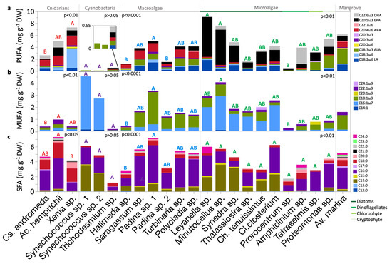 Macroalgae generally displayed an order of SFA > PUFA > MUFA. SFA, PUFA, and MUFA contents varied among strains (p < 0.05; Dunn test; Table S1 and Figure 3a). The Av. marina mangrove leaves exhibited nearly equal PUFA and SFA contents, both higher than the MUFA content.