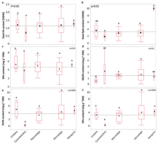 Total FA content showed no significant variation between the groups (Figure 5a). Total lipid content varied between the groups (p < 0.01; Kruskal–Wallis test; Figure 5d). SFA content varied non-significantly between groups (p > 0.05; Dunn test; Figure 5c). The MUFA content was significantly lower in cnidarians than in eukaryotic microalgae, and macroalgae (p < 0.01; Dunn test; Figure 5d). PUFA and EFA are lowest in cyanobacteria compared to other groups (p < 0.01; Dunn test; Figure 5e,f).