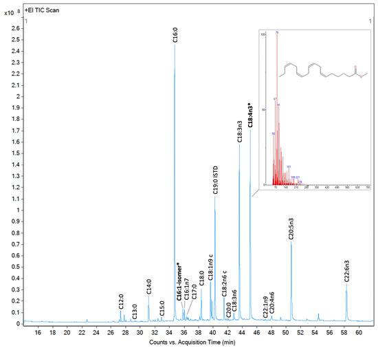 Total ion current chromatogram of fatty acid methyl esters (FAMEs) detected by GC/MS for Proteomonas sp. (cryptophyte). FAMEs were annotated and quantified using the 37-component FAME mix and a calibration curve prepared from it. FAMEs marked in bold and with an asterisk were identified based on their mass spectra using the NIST library.