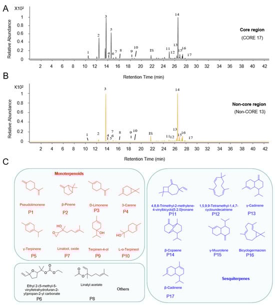 GC-MS typical total ion chromatograms (TICs) of volatile compounds in the pomelo. Comparative analysis of essential oils in the fruit of pumelo in different planting areas: (A) TICs of volatile compounds in the HJH from the core region (CORE 17); (B) TICs of volatile compounds in the HJH from the non-core region (Non-CORE 13). Numbers represent the common peak order in both COREs and Non-COREs; (C) Classification of volatile oil from HJH. Numbers represent the peak order. The peak number represents the common peak in (A,B).