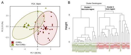 Comparative analysis of essential oils in pomelo fruit collected from different regions: (A) Principal component analysis (PCA) of Euclidean distance for the essential oil contents in core and the non-core region samples; (B) Dendrograms of the hierarchical cluster analysis (HCA) result. Red points mean COREs. Olive green points mean Non-COREs. Red fond means COREs, and olive green fond means Non-COREs.