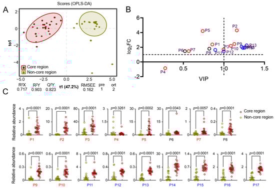 Screening of volatile compound quality markers across samples from different regions: (A) Score plot of orthogonal partial least squares discrimination analysis (OPLS-DA) models for the classification of pomelo; (B) Quadrant plot constructed using the Variable Importance in Projection (VIP) values obtained from OPLS-DA as the x-axis, while the y-axis represents the Log2FC values of the relative abundance of volatile compounds. Compounds with VIP values greater than 1 and Log2FC values greater than 1 were selected as potential quality markers; (C) Results of t-tests on the relative abundance of compounds across different regions. P1, pseudolimonene; P2, β-pinene; P3, D-limonene; P4, 3-carene; P5, γ-terpinene; P6, ethyl 2-(5-methyl-5-vinyltetrahydrofuran-2-yl)propan-2-yl carbonate; P7, linalool oxide; P8, linalyl acetate; P9, terpinen-4-ol; P10, α-terpineol; P11, 2-methylene-4,8,8-trimethyl-4-vinyl-bicyclo[5.2.0] nonane; P12, 1,5,9,9-tetramethyl-1,4,7-cycloundecatriene; P13, γ-cadinene; P14, β-copaene; P15, γ-muurolene; P16, bicyclogermacren; P17, β-cadinene. Red represents monoterpenes, blue represents sesquiterpenes, and black represents other types of compounds in Figure 3B.